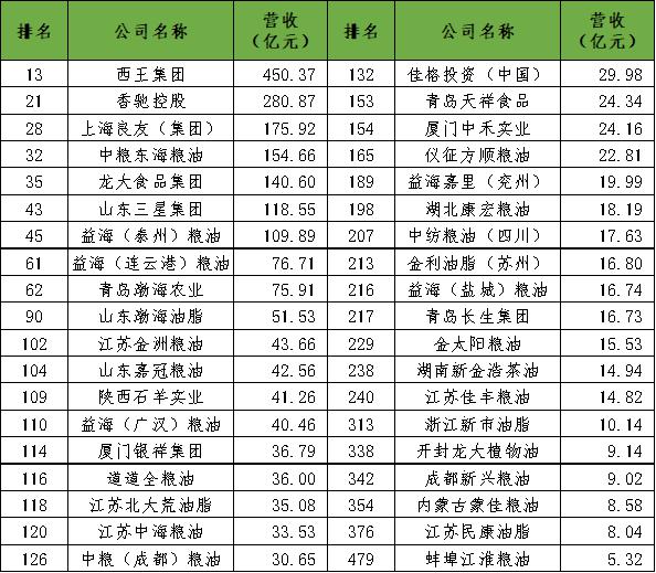 11月初,2020年中国农业企业500强榜单发布。今年评定主要参考营业收入和利润,按照2018年企业营业收入进行排名,入围门槛为5亿元,全国28个省(市、区)参与排名,其中营业收入过百亿的农业企业有49家。有多家主营业务为食用油或涵盖食用油的企业上榜,这些企业油脂加工能力、经营规模都较强,在行业内具有较大的影响力。虽然该榜单依据的是2018年营收数据,有些实力油企并未纳入参评,但由于统计数据往往滞后,而且2019年存在贸易战影响的因素,一些企业的正常经营受到干扰影响,因此该榜单仍具有相当的参考性。