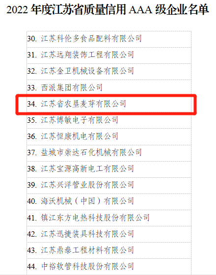 2022年11月30日,江苏省市场监督管理局与江苏省发展和改革委员会发布2022年度江苏省质量信用AAA、AA级企业名单,麦芽公司获评江苏省质量信用AAA级。
