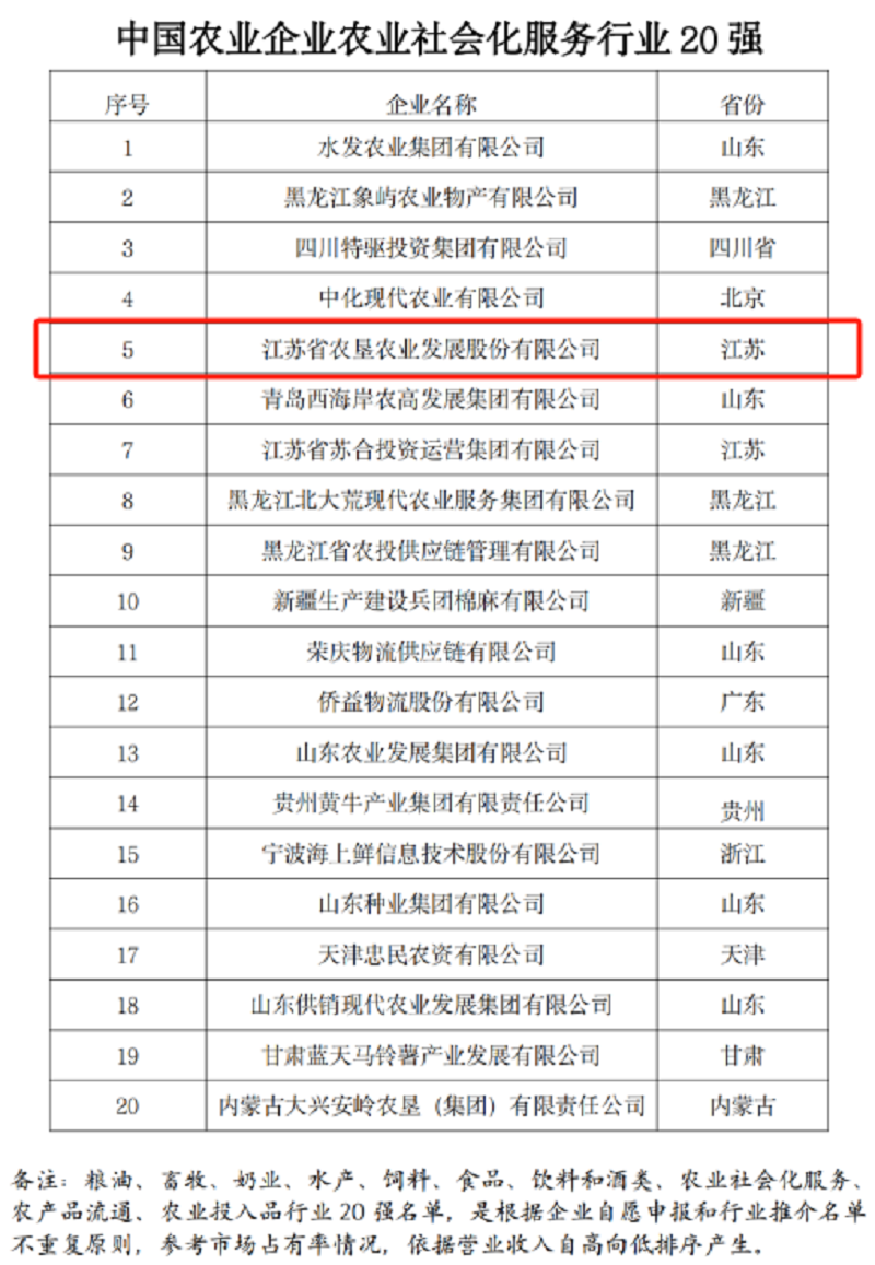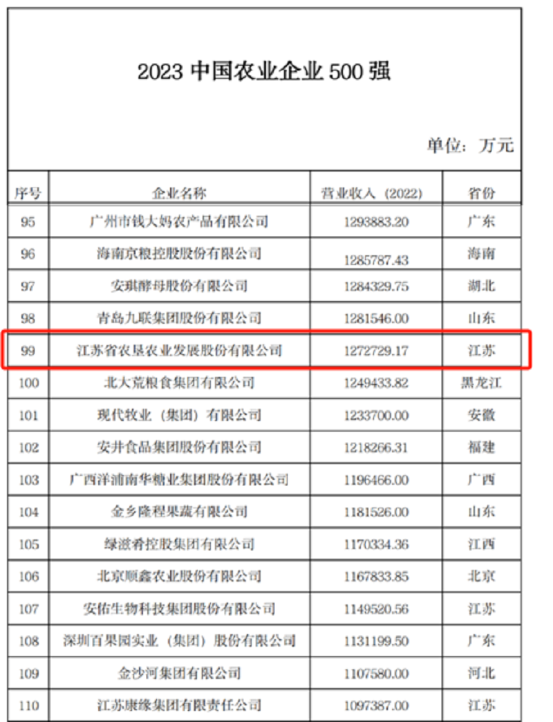 近日,农民日报社发布了2023中国农业企业500强名单,苏垦农发再次成功入选,位列第99位,较去年提升22位;此次活动还评选了2023中国农业企业行业20强名单,苏垦农发再次入选农业社会化服务行业20强,位列第5位,较去年上升1位。再度入选中国农业企业500强、中国农业企业行业20强,标志着苏垦农发行业地位得到进一步认可和巩固,竞争优势得到进一步凸显和提升。
