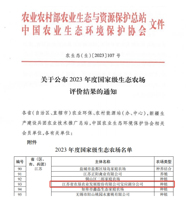 近日,农业农村部农业生态与资源保护总站、中国农业生态环境保护协会公布了2023年度国家级生态农场评价结果,好球平台宝应湖分公司成功入选,是江苏省25家单位中唯一一家协会理事推荐单位。