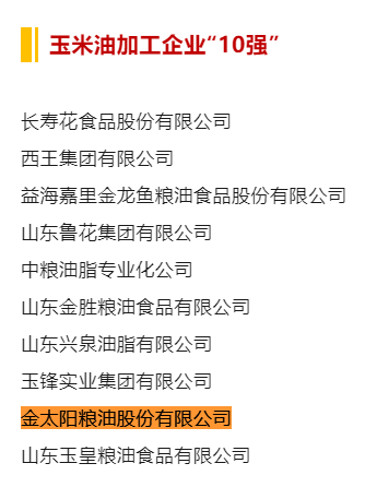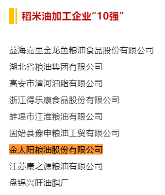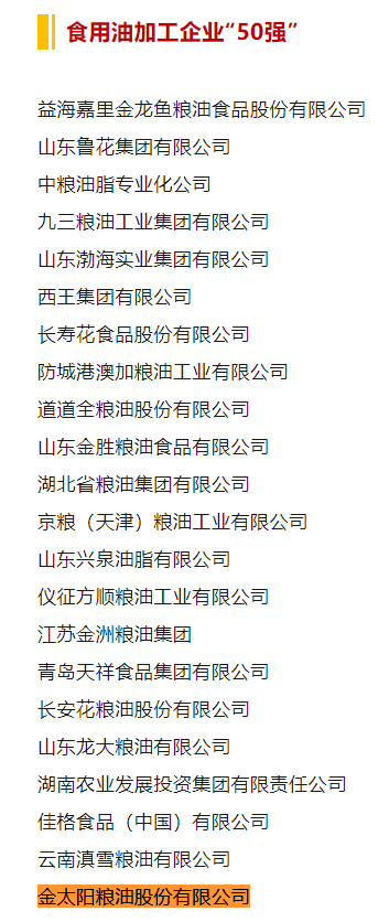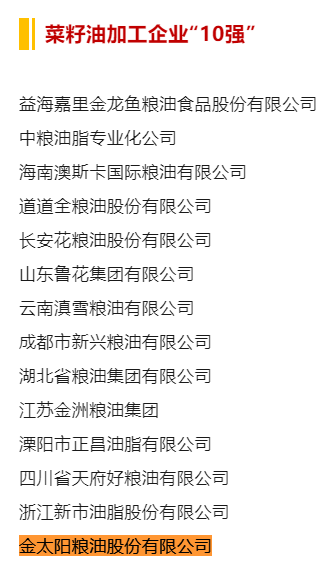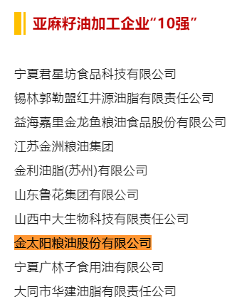 近日,中国粮食行业协会根据《关于进行2024年度重点粮油企业和各省粮油加工业专项调查的通知》(中粮协〔2024〕2号),组织行业专家开展了2023年度重点粮油企业专项调查,按照产品销售收入、产量、产能、利税、利润等指标综合审定,公示了2023年度重点粮油企业专项调查结果。金太阳粮油股份有限公司再度入选食用油加工企业“50强”、玉米油加工企业“10强”、稻米油加工企业“10强”、葵花籽油加工企业“10强”、亚麻籽油加工企业“10强”等5项榜单,首次入选菜籽油加工企业“10强”榜单。
