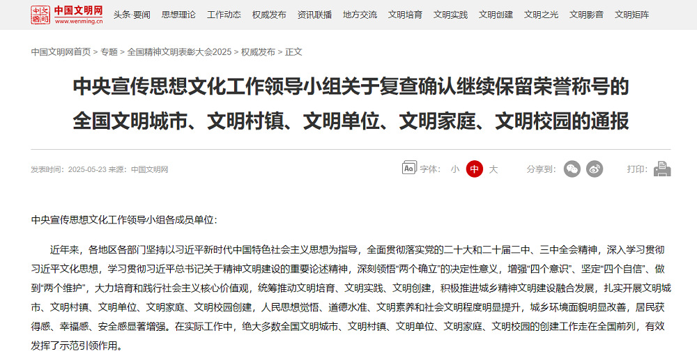 5月23日,中央宣传思想文化工作领导小组公布《关于认定命名第七届全国文明城市、文明村镇、文明单位和第三届全国文明家庭、文明校园的决定》和《关于复查确认继续保留荣誉称号的全国文明城市、文明村镇、文明单位、文明家庭、文明校园的通报》。苏垦农发顺利通过复查评估,继续保留“全国文明单位”称号,这是继2020年首创首成第六届“全国文明单位”后又一次获此殊荣。